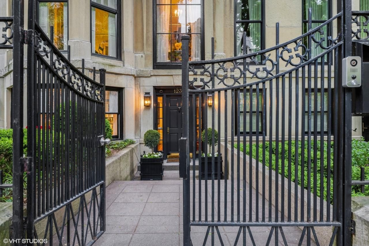 This jewel of design, classic row home in Chicago's sought-after Gold Coast sits on a tree-lined street, boasting five bedrooms + den, three and a half baths, and four fireplaces throughout. Built in the late 19th century, the limestone residence is placed in a block of nine known as the Fairbank Row Houses named after a high-society couple, Kellogg and Janet Ayer Fairbank. The pair lived in one of the residences and likely owned others. Prolific architect David Adler also lived in one of the homes as a newlywed; he may even be the reason steps that originally led from the sidewalk to the homes' second level were eventually removed. Given its historical status, this incredibly updated estate benefits from a select homeowner tax exemption. Greeted by a gated, well-manicured garden and first-class foyer, soaring bay windows and French doors to a grand patio send light throughout the generously-sized living spaces. The eat-in kitchen features herringbone flooring, a built-in electric fireplace, an in-island Sharp drawer microwave, a top-of-the-line Thermador oven, stainless steel Kohler refrigerator, and access to a mudroom creating two entrances to the impressive, private patio pristinely built for indoor/outdoor living. The second floor of the estate continues expansive ceiling height, deep crown moldings, and hardwood flooring, beginning with a laddered wet bar equipped with a built-in icemaker and combined, half-beverage half-wine cooler. The neighboring library with its own wood-burning fireplace and custom built-in bookshelves creates a relaxing space that remains flooded in light by floor-to-ceiling windows. Adjoined is a second-level great room that mirrors the bay windows of the lower level, also featuring a wood-burning fireplace and large scale, double-door entrances with unique and charming fixtures. The primary suite is located on the third level, featuring iconic shutters on its bay windows, a walk-in closet with well appointed, custom built-in organization systems, and a marble mantle fireplace. The marble-floored primary bath's highlights include heated floors, a heated towel bar, and a Riobel soaking tub, Rainshower, and double sinks set in smooth marble to create ease of living. An expansive secondary suite with full bath furnished with a Grohe faucet and shower also joins this floor. The final, fourth level is a retreat of three more bedrooms and a den. All full baths feature heated, marble flooring, marble countertops, and towel racks for luxurious, spa experiences on the day to day. The uppermost bath also has a stunning skylight, flooding the high-ceiled space in sunlight. Enhancing everyday life is a 2-car garage, laundry on the third floor with LG's bright red stackable system for ease of access, full basement, two HVAC systems, radiant heating throughout, and a NuTone intercom system sustaining connection throughout the estate. Offering a prime location and appointed for great comfort, this gem of a home is ready